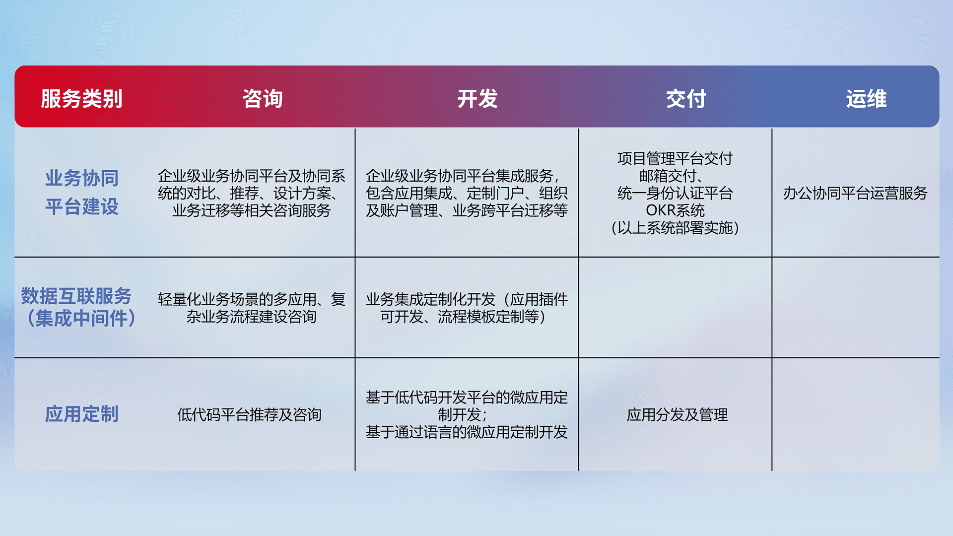 针对钉钉、、、企微、、、IDaas等平台级产品提供产品的规划、、、、方案、、、交付、、定制化开发等服务,,实现如统一协同办公、、智能客户服务、、混合会议管理、、、、智能数据查询、、、等业务场景,,,,实现数字化转型。。。